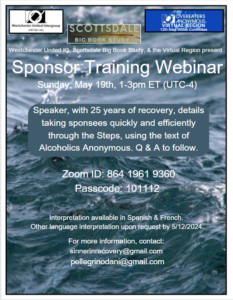 « All Events This event has passed. Sponsor Training Webinar May 19, 2024 @ 1:00 pm - 3:00 pm EDT « Celebrate May Day! 12 Week Traditions Study (register by May 10) » See flyer for details… Add to calendar Google Calendar iCalendar Outlook 365 Outlook Live Details Date: May 19, 2024 Time: 1:00 pm - 3:00 pm EDT Organizers Westchester United Intergroup OA Virtual Region Venue Virtual Event