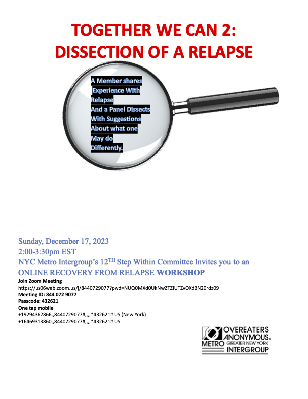 NYC Metro Intergroup’s 12th Step Within Committee Invites you to an ONLINE RECOVERY FROM RELAPSE WORKSHOP
